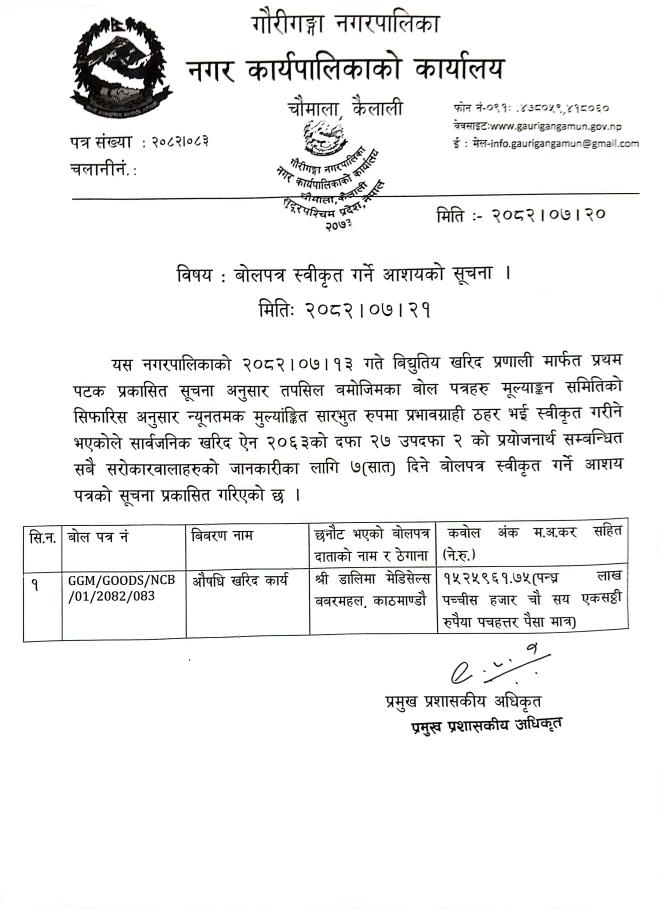 औषधि खरिद सम्बन्धी बोलपत्र स्वीकृत गर्ने आशयको सूचना ।