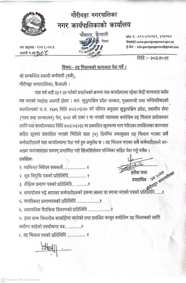 तह मिलानको कागजात पेश गर्ने सम्बन्धमा ।
