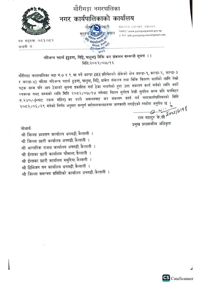 » नदिजन्य पदार्थ (ढुङ्गा, गिट्टि, बालुवा) विक्रि कर संकलन सम्बन्धी सूचना ।
