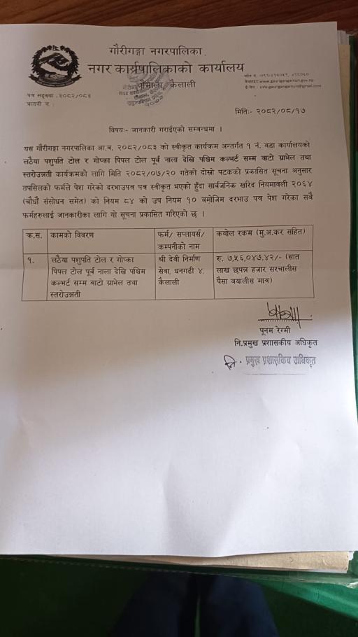 सिलबन्दी दरभाउपत्र स्वीकृत भएको जानकारीको सूचना !!!
