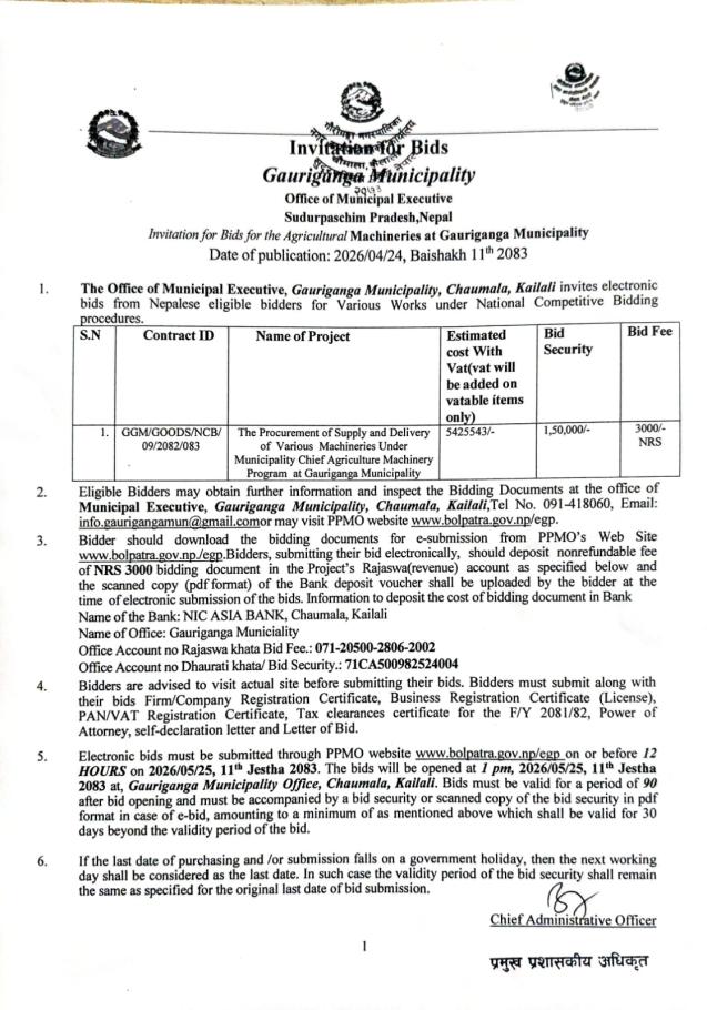 » Invitation for Bids for the Agricultural Machineries at Gauriganga Municipality