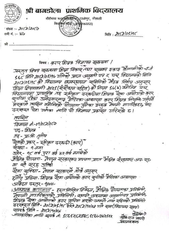 about करार शिक्षक आवश्यकता सम्बन्धि सूचना ।