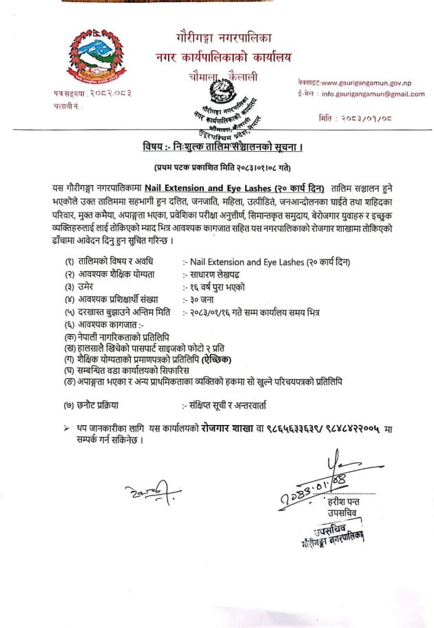 about Nail Extension and Eye Lashes सम्बन्धी निःशुल्क तालिम सम्बन्धमा ।