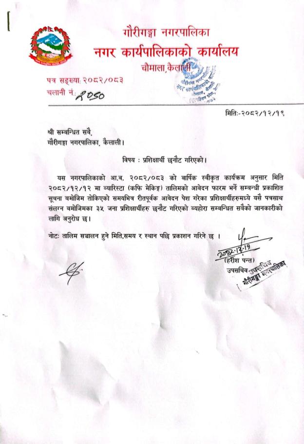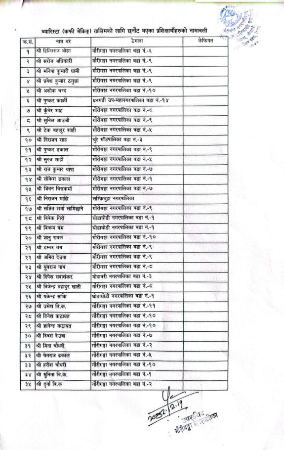 बारिस्ता तालिमका लागि प्रशिक्षार्थी छनोट गरिएको सम्बन्धमा ।