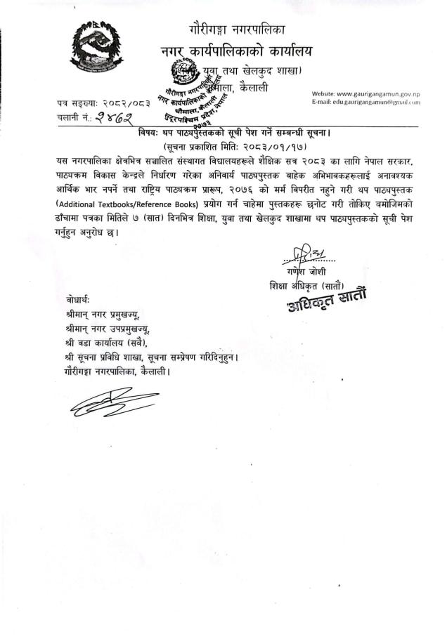 थप पाठ्यपुस्तकको सूची पेश गर्ने सम्बन्धी सूचना ।