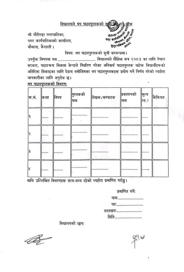 थप पाठ्यपुस्तकको सूची पेश गर्ने सम्बन्धी सूचना ।