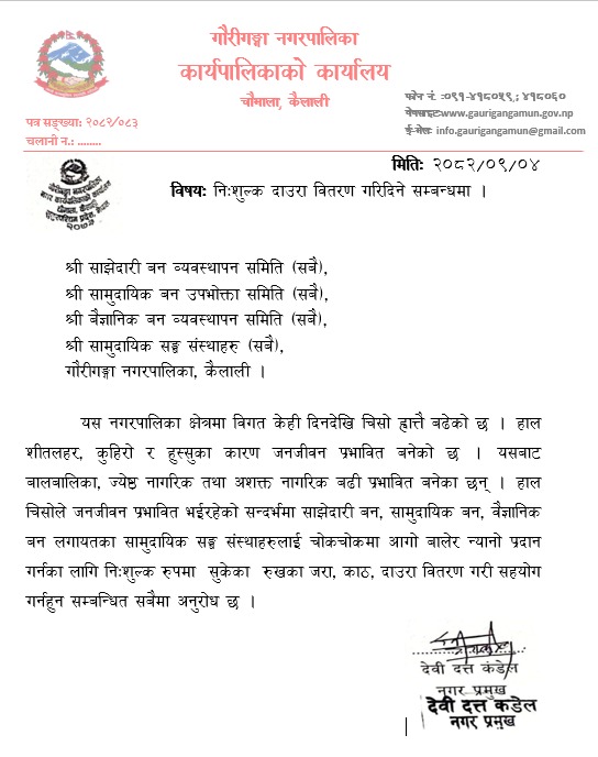» निःशुल्क दाउरा वितरण गरिदिने सम्बन्धमा ।