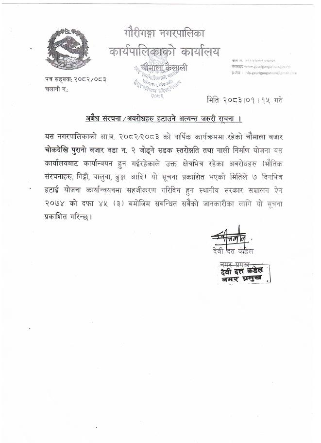 » अबैध संरचना/अवरोधहरु हटाउने अत्यन्त जरुरी सूचना ।